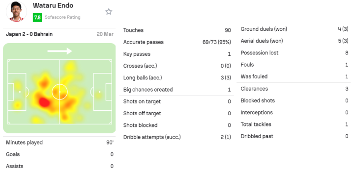 本周国际赛事中,远藤航作为日本国家队的一员,在2-0战胜巴林的比赛中首发并打满全场,展现出了出色的表现。这位年轻球员在比赛中两次盘带,一次成功,并在防守端完成了一次抢断和三次解围。他展现出出色的控球能力,共有90次触球和73脚传球,传球成功率高达95%。